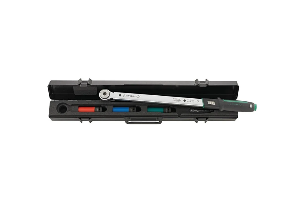 Radmontagesatz 750NR/200/3/1 5-tlg.im stabilen Ku.-Koffer+Einlage STAHLWILLESEVENFIVEZERO-Drehmomentschlüssel mit 1/2″ Feinzahnknarre (60 Zähne) sowie 3 Radmuttern-Steckschlüsseleinsätze (SW 17, 19, 21) mit Kunststoffhülse zum Schutz empfindlicher Felgen · Auslösung über hör- und fühlbares Signal („Klick“) bei Erreichen des voreingestellten Werts. Einstellung über Drehknopf am Griffende (1 Umdrehung = 10 Nm) · Steckschlüsseleinsätze mit Kugelarretierung für sichere Kraftübertragung – auch bei tiefliegenden Verbindungen · präzise Einstellung über QuickSelect-Schnellverstellung · Auslösemechanismus ist unempfindlich gegenüber Weiter- und Gegenbelastung (bis zur Messbereichsgrenze) · Fixierung des Sollmoments durch Rastung, sofort einsatzbereit nach Entlastung. Doppelskala Nm/ft·lb · Anzeigeabweichung: ± 4 % · Kalibrierschein gemäß DIN EN ISO 6789-2:2017 · Kalibrierung kompatibel mit perfectControl®-System Weitere technische Eigenschaften: · Ausführung: im stabilen Kunststoffkoffer + Einlage · Inhalt: 5-teilig · prüfpflichtig: ja · Gesamtlänge: 680mm · Skalenteilung: 10 Nm /20lbf.ft · Breite mm (b): 81mm · Gewicht (g): 2940g · Höhe mm (h): 66mm
