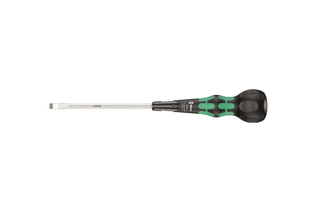 Schraubendreher 1834 6mm Klingen-L.120mm WERAfür Schlitzschrauben · Klinge: rund · nicromatt · Lasertip-Spitze · Kraftform Ball-Grip mit Abrollschutz, mehrkomponentig · mit Werkzeugfinder Take it easy: Farbkennzeichnung nach Profilen (Gelb = Schlitz) und Größenstempelung Weitere technische Eigenschaften: · Klingen-Ø: 6mm · Schneidenstärke: 1mm · Abrollschutz: ja · Gesamtlänge Klinge: 150mm · Gesamtlänge Klinge in Zoll: 6"Zoll · Grifflänge: 135mm · Klingenbreite (in Zoll): 1/4"Zoll · Klingenlänge (in Zoll): 4 23/32"Zoll · Kraftform Griff: ja · Lasertip: ja · Take it Easy Kraftform Schraubendreher: ja