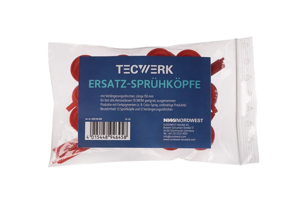 Ersatzsprühköpfe je 12 Sprühköpfe u.Röhrchen (150 mm) Ku.Btl.TECWERKmit Verlängerungsröhrchen · passend für fast alle Aerosoldosen TECWERK – nicht geeignet für Produkte mit Farbpigmenten (Colorspray, Markierspray, Kupferspray etc.), zinkhaltige Produkte (Zink-Spray, Zink-Alu-Spray etc.) und Sprühkleber, da Sprühkopf sehr schnell verstopft/verklebt · Beutelinhalt: je 12 Sprühköpfe und Verlängerungsröhrchen (Länge 150 mm)