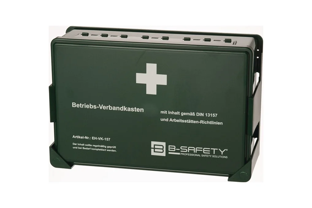 Betriebsverbandkasten DIN 13157 B270xH175xT90ca.mm grün B-SAFETYB-Safety Betriebsverbandkasten STANDARD aus Kunststoff, grün. Inklusive Wandhalterung und Inhalt, 85-teilig, gemäß DIN 13157:2021-11 in Folientasche. · inkl. Inhalt (85-teilig) und Wandhalterung Weitere technische Eigenschaften: · Material: PP-Kunststoff · prüfpflichtig: ja