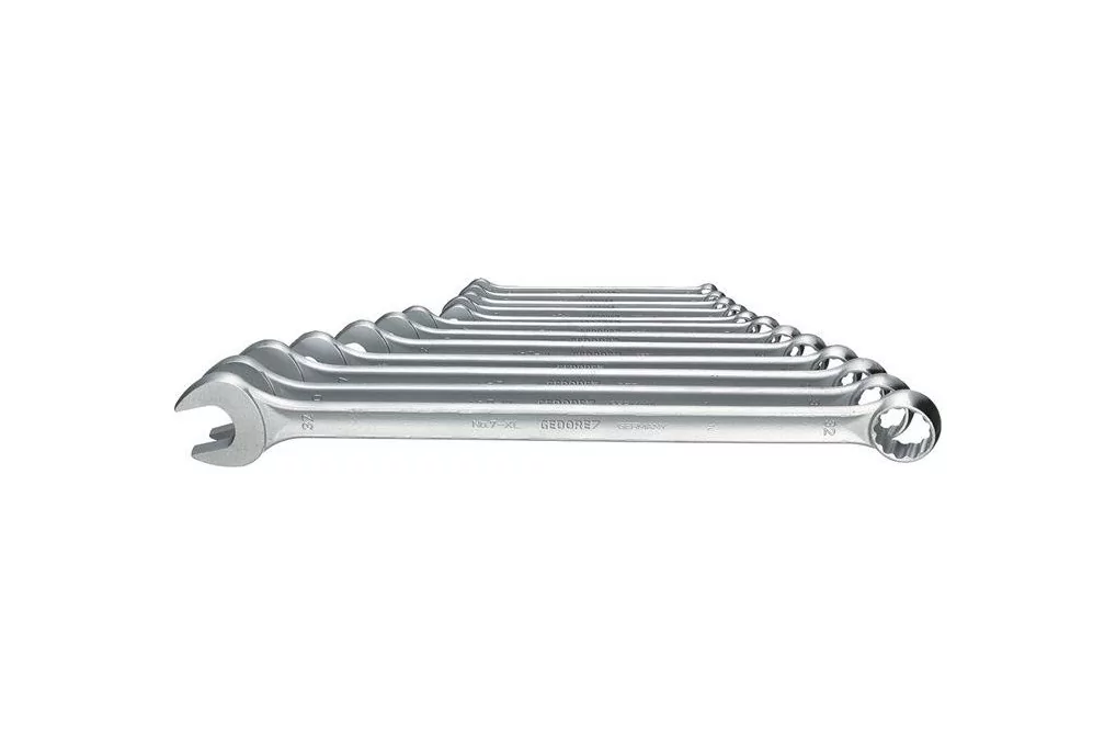 Ringmaulschlüsselsatz 7 XL-012 12-tlg.SW 10-32mm Form A CV-Stahl GEDOREextra lang · CV-Stahl · verchromt · mit gleichen Schlüsselweiten · Ringseite 15° abgewinkelt, Maulstellung 15° ähnlich DIN 3113 Form A Weitere technische Eigenschaften: · Sc