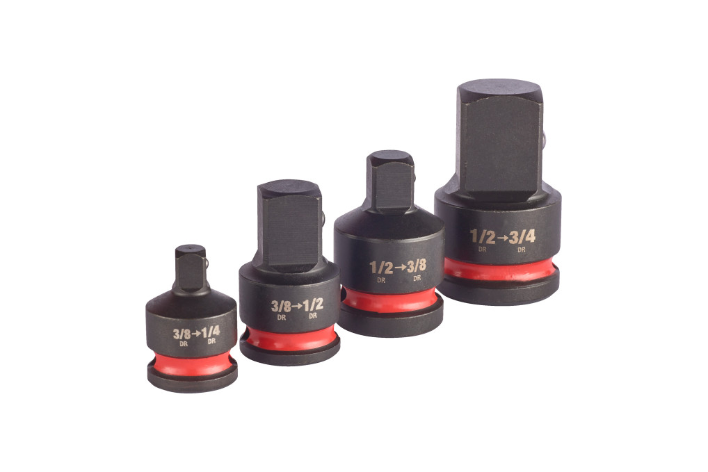 - Schlagnussadapter 4 tlg., beinhaltet je 1 Adapter 3/8Zoll auf 1/4Zoll, 3/8Zoll auf 1/2Zoll, 1/2Zoll auf 3/8Zoll und 1/2Zoll auf 3/4Zoll