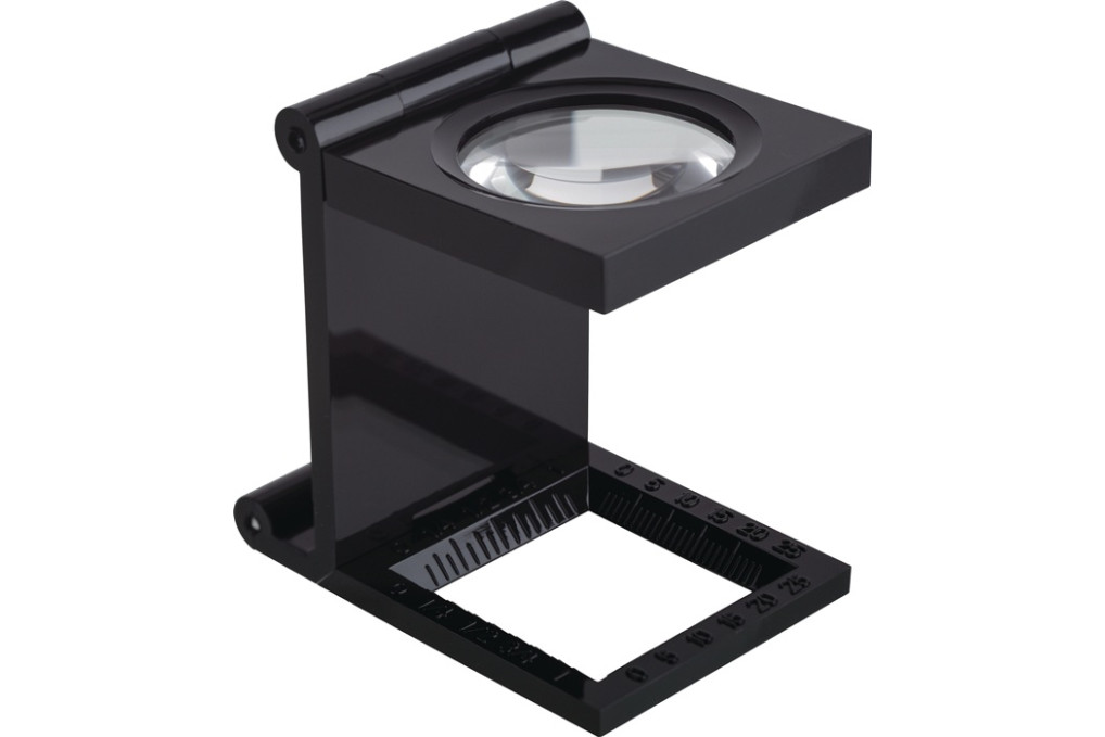 Fadenzähler Basic-Line 5x Linsen-D.30mm SCHWEIZERbikonvexe Kunststofflinse · Gestell aus schwarzem Kunststoff · sehr leichte Ausführung Weitere technische Eigenschaften: · Höhe: 58mm · Teilung: 0,1mm