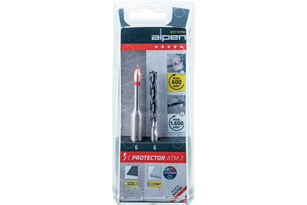 Feinsteinzeugfliesenbohrerset C PROTECTOR D.6mm 2 St./Set ALPEN2-teilig · Einsatzbereich: Für extrem harte Steinzeugfliesen bis Mohs-/Ritz-Härte 9 sowie Glas und Porzellan · keine Kühlung erforderlich · nicht geeignet zum Schlagbohren Weitere technische Eigenschaften: · Einsatzbereich: Für extrem harte Steinzeugfliesen bis Mohs-/Ritz-Härte 9 sowie Glas und Porzellan. Keine Kühlung erforderlich. Nicht geeignet zum Schlagbohren.
