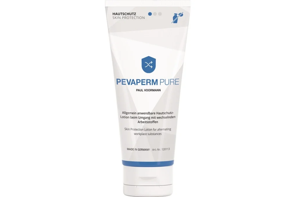 Hautschutz PEVAPERM PURE 100ml unparfümiert Tube PAUL VOORMANNallgemein anwendbare Hautschutz-Lotion · pH-hautneutral · silikonfrei · unparfümiert · schützt vor wässrigen und nicht wässrigen Arbeitsstoffen, Kühlschmierstoffen, wässrige Lösungen, Öle, Fette, Teer, Bitumen, Farben, Ruß, Pigmente, Zement, Kalk, diverse Klebstoffe, PU-Schäume, Abdichtungsmaterialien etc · HACCP-bewertet und dermatologisch an sensibler Haut mit "sehr gut" getestet · enthält natürliches α-Bisabolol als wirksamen Inhaltsstoff der Kamille (entzündungshemmend) · Anwendung: vor der Arbeit und nach Pausen in die saubere und trockene Haut sorgfältig einreiben (insbesondere Nagelbett) · ist am ganzen Körper anwendbar Weitere technische Eigenschaften: · Reinigungsbereich: Hautschutz