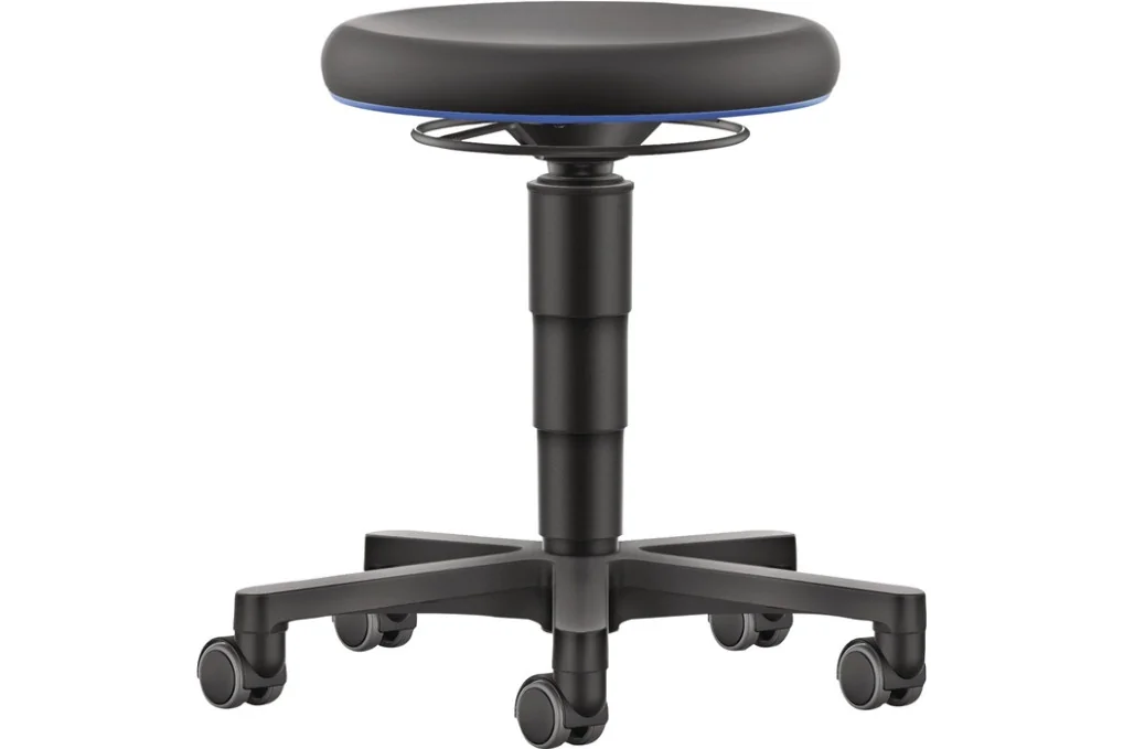 Drehhocker Rl.Kunstleder schwarz Sitz-H.450-650mm BIMOSnach DIN 68877 · bedienungsfreundliche Gasfeder-Sitzhöhenverstellung mit umlaufender Ringauslösung · blaue Ringabdeckung zum Schutz der Polster · Sitz Ø 400 mm, mit Kunstlederpolster, abwaschbar, desinfektionsmittelbeständig, weich und bequem kompaktes · Fünffuß-Untergestell aus Kunststoff Ø 540 mm mit weichen Universalrollen für leichtgängiges Rollen über alle Böden