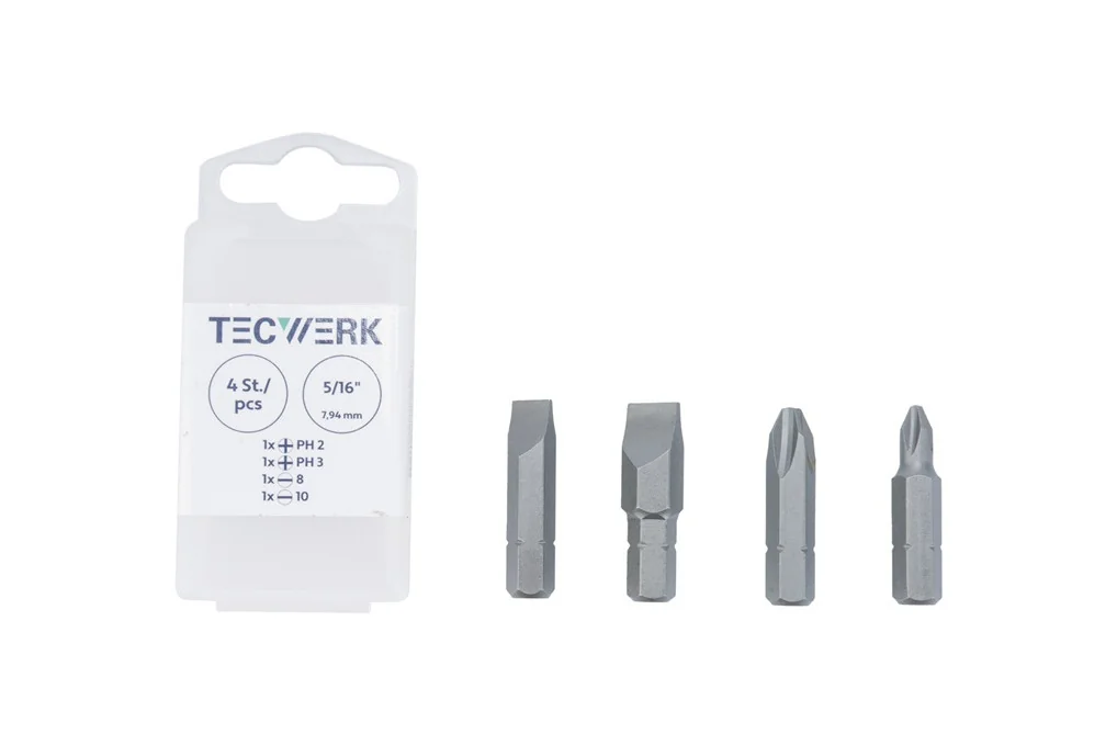Bitset 4tlg.5/16 Zoll Schlitz 8+10 mm,PH 2+3 f.2000 828 191 TECWERKErsatz-Bits 7,94 mm (5/16″) passend zum Schlagschrauber Art.-Nr. 2000 828 191 Inhalt: je 1 Bit für Schlitzschrauben 7,94 mm (5/16″), 8 x 1,2 / 10 x 1,2 mm, je 1 Bit für Schrauben mit Kreuzschlitz (PH) 7,94 mm (5/16″), Gr. 2 / 3 Weitere technische Eigenschaften: · Inhalt: 4 teilig