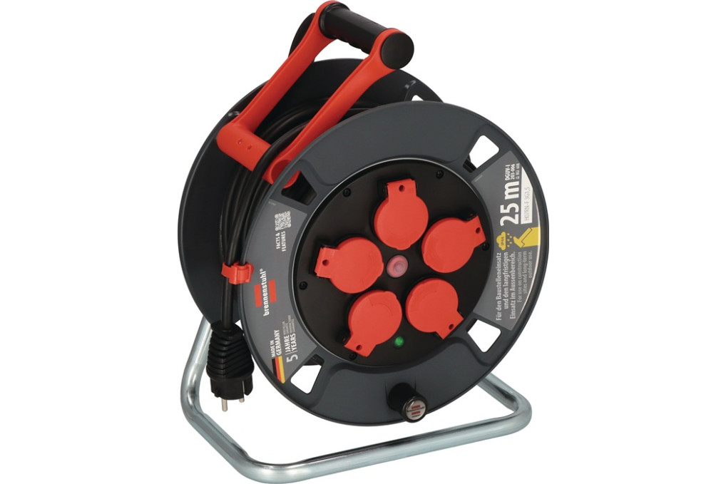 Kabeltrommel 300 KU 2100 25m Gummi-Neopren 3x1,5mm² 300mm 5 Ku.IP44 BRENNENSTUHLaus Kunststoff · spritzwassergeschützt · eignet sich ideal für den Baustelleneinsatz und den Einsatz im Freien · innovativer Tragegriff ″cablepilot″ für die perfekte Kabelführung · pendelt auf beiden Seiten und ermöglicht bequemes Tragen und Aufhängen · mit Drehgriff für komfortables Aufrollen· mit 5 spritzwassergeschützten Schutzkontakt-Steckdosen · Kontroll-Leuchte bei Überhitzung und Überlastung und einer optischen Bereitschaftsanzeige im Steckdoseneinsatz · mit Trommelbremse · Leistung aufgerollter Zustand 230V: 1000W Leistung abgerollter Zustand 230V: 3300W · Schutzart IP44 Gummikabel H07RN-F 3G1,5 RN-Kabel ist zugelassen für erschwerte Baubedingungen nach VDE 0100 Teil 704 Betriebsmittel der Kategorie 2 (K2 DGUV 203-005): Einsatz für den rauen Betrieb mit hohen mechanischen, physikalischen und chemischen Einwirkungen M Weitere technische Eigenschaften: · prüfpflichtig: ja · Adernzahl: 3 · Anschlusstechnik: Schraub-/Lüsterklemme · Anwendung: Gewerbe/ Baustelle · Anzahl der Schutzkontakt-Steckdosen: 5 · Einsatzbereich: Außen · Gehäusefarbe: grau · Grundfarbe: grau · Hammerzeichen: Ja · Kabelbezeichnung: H07RN-F 3G1,5 · Kabeleinführung ins Gehäuse: Knickschutztülle · Leistung abgerollter Zustand 230V: 3300W · Leistung aufgerollter Zustand 230V: 1000W · Material des Tragegriffes: Kunststoff · Mit Arretierung: Ja · Mit Bereitschaftsanzeige: Ja · Mit CABLEPILOT: Ja · Mit Drehgriff: Ja · Mit Gestell: Ja · Mit Klappdeckel/ Deckel: Ja · Mit Kontroll-Leuchte: Ja · Mit Stecker: Ja · Mit Steckergarage: Ja · Mit Tragegriff: Ja · Mit Überhitzungsschutz: Ja · Schutzklasse: II · Schutzleiter: G · Steckerart: Gerader Stecker · Stecksystem Steckdose: F · Stecksystem Stecker: E+F · Vorschrift/ Norm: BGI 608