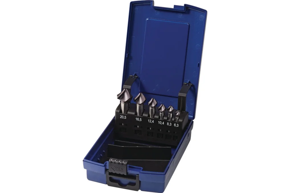 Kegelsenkersatz DIN 335C 90Grad 6,3-20,5mm HSS-Co TiAlN 6-tlg.Ku.-Kass.TECWERKHSS-Co · TiAlN-beschichtet · DIN 335 C · 3 ungleiche konvexe Schneiden · spiralgenutet · Senkwinkel 90 ° · rechtsschneidend · zur Bearbeitung von Stahl, rost- und hitzebeständigen Stählen, Aluminium, Messing und Kunststoff · Vorteile: · runde, exakte und ratterfreie Senkung · 60 % geringere Vorschubkraft · 50 % geringere Radialkraft · Einsatz in nahezu allen Materialien · extrem hohe Standzeiten aufgrund spiralisierter Schneiden/HSS-Co Stahl und TiAlN-Beschichtung möglich Weitere technische Eigenschaften: · Verpackung: Kunststoffkassette