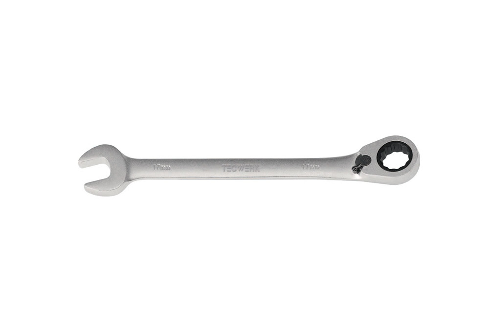 Maulringratschenschlüssel SW 24mm L.325mm umschaltb.TECWERKumschaltbar · CV-Stahl · matt verchromt · Maulstellung 15°, Ringseite um 15°, abgewinkelt · 72 Zähne Weitere technische Eigenschaften: · Material: Chrom-Vanadium-Stahl