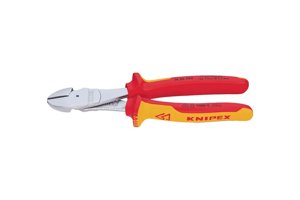 Kraft-Seitenschneider isoliert m.MK-Hüllen VDE verchromt 250mmVDE-isoliert bis 1000 V · gefertigt gem. DIN EN/IEC 60900, stückgeprüft · 20 % Kraftersparnis gegenüber herkömmlichen Seitenschneider · Schneiden zusätzlich induktiv gehärtet, Schneidenhärte ca. 64 HRC · Chrom-Vanadin-Hochleistungsstahl, geschmiedet, mehrstufig ölgehärtet Zange verchromt Weitere technische Eigenschaften: · Form: 0 · Norm: DIN ISO 5749, DIN EN 60900 · Facette: mit · Kennzeichnung: VDE · Gewicht: 465g · Norm IEC: IEC 60900