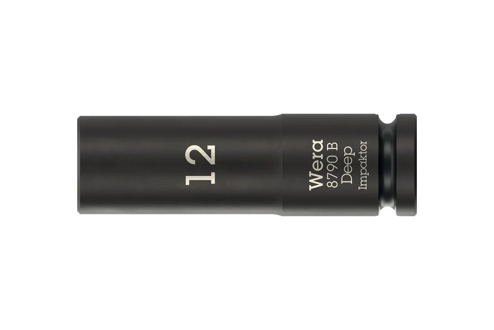 Steckschlüsseleinsatz 8790 B Impaktor Deep 3/8 Zoll 12mm L.63mm WERArobuste Impaktor-Steckschlüsseleinsätze für extrem hohe Beanspruchung · für den Einsatz mit Elektro- oder Druckluft-Schlagschraubern mit 3/8″ Antrieb Weitere technische Eigenschaften: · Außenmaß (d1): 18,2mm · Durchmesser hinten (d2): 20,0mm · Icon links: Außensechskant · Icon rechts: Aussenvierkant · Schlagschrauberfest: ja · Take it easy Nuss: ja
