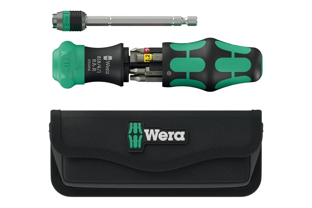 Magazinbithalter Kraftform Kompakt 26 RA-R 6-tlg.m.Tasche WERAgeeignet für Bits mit 1/4″-Außensechskantantrieb nach DIN ISO 1173-C 6,3 und E 6,3 und Wera Anschluss-Reihen 1 und 4 · im Griff integrierte Ratsche mit Feinverzahnung, intuitives Umschalten · für präzise Arbeiten kann die Ratschenmechanik mit der 0-Position deaktiviert werden · 1/4″-Innensechskantaufnahme, magnetisch · Verbindungsteil · Teleskopklinge · Rapidaptor-Technologie mit rapid-in, rapid-out, rapid-spin, chuck-all und single-hand-Funktion · 4 BiTorsion Bits für lange Lebensdauer, zähhart, für den universellen Einsatz · Take it easy Werkzeugfinder: Mit Abtrieb-Farbkennzeichung und Größenstempel für einfaches Finden des gewünschten Bits, 2 Bits, zähhart, für den universellen Einsatz · Kraftform-Griff mit Abrollschutz, mehrkomponentig, integriertes Magazin Weitere technische Eigenschaften: · Abrollschutz: ja · Bithalter mit Rapidaptor-Schnellwechselfutter: ja · BiTorsion: ja · Icon links: Innenvierkant · Kraftform Griff: ja · Rückholwinkel: 6Grad · Take it easy Bits: ja · Teleskopklinge: ja · Umschalten Ratschenschraubendreher: ja