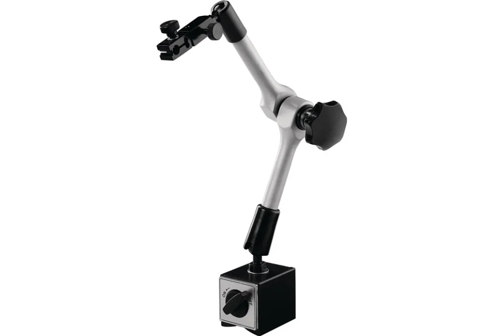 Magnetmessstativ R. 200mm Gesamt-H. 310mm Haftkraft 500 Nmit Gelenkarm · mit mechanischer Zentralklemmung und Feineinstellung · große Beweglichkeit bei hoher Spannkraft mittels eines Spanngriffes · abschaltbarer Magnetfuß mit prismatischer Sohle · Messuhraufnahme 8 mm H7 Weitere technische Eigenschaften: · Magnetfußtiefe: 50mm · Magnetfußhöhe: 55mm · Messuhraufnahme: 8mm · Magnetfußbreite: 65mm