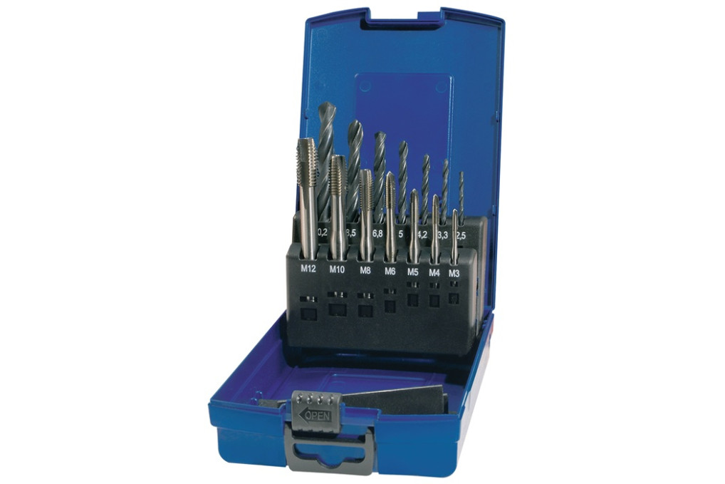 Maschinengewindebohrerset DIN 371/376 C M3-M12 14tlg.HSS Ku.-Kass.TECWERKM3 - M12 · bestehend aus: je 1 Stück MGB, HSS-Co, DIN 371 M3/ M4/ M5/ M6/ M8/ M10 DIN 376 M12 je 1 Stück Spibo Ø 2,5/ 3,3/ 4,2/ 5,0/ 6,8/ 8,5/ 10,2 mm Weitere technische Eigenschaften: · Ausführung Spiralbohrer: DIN 338, HSS · Norm: DIN 371/376 · Schneidstoff: HSS · Inhalt: 14 teilig
