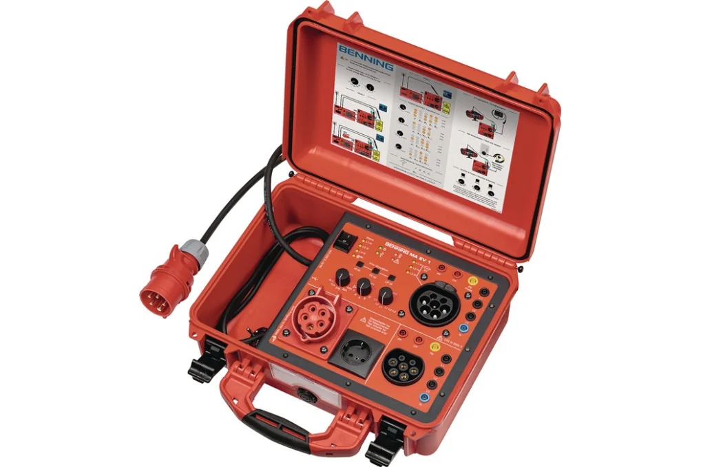 Messadapter MA EV 1 f.EV-Ladekabel (Mode 2+3)+Wallboxen BENNINGfür Mode 2 & Mode 3 Ladekabel und Wallboxen · zur Prüfung nach DIN VDE 0701/0702 und DIN VDE 0100-600 / 0105-100, Prüfung von Mode-2-Notladekabeln (BENNING ST 755+/760+) und Mode-3-Ladekabeln in Kombination mit Installationstestern (IT 130/200) · Fahrzeugsimulation (CP-Status A–D), Ladekabel-Simulation (PP-Status NC, 13–63 A) · Fehlersimulationen: Kurzschluss Diode, CP-Signal, PE offen · LED-Anzeigen für Netz- und Fahrzeugseite (L1/L2/L3-N) · Prüfungen: RPE, RISO, IPE/IBER, RCD (30 mA AC / 6 mA DC), Durchgang, Kurzschluss, Drehfeld · Mini-USB-Anschluss für Datenaustausch und Firmware-Update Anschlüsse: - Infrastruktur: Typ 2, CEE 16 A (5-polig), Schuko, 4-mm-Sicherheitsbuchsen - Fahrzeugseite: Typ 2, 4-mm-Buchsen (L1/L2/L3, N, PE, PP, CP) Versorgung: - 1,5 m Schuko-Kabel & 2 m CEE-Kabel, 16 A Weitere technische Eigenschaften: · 3,6 V