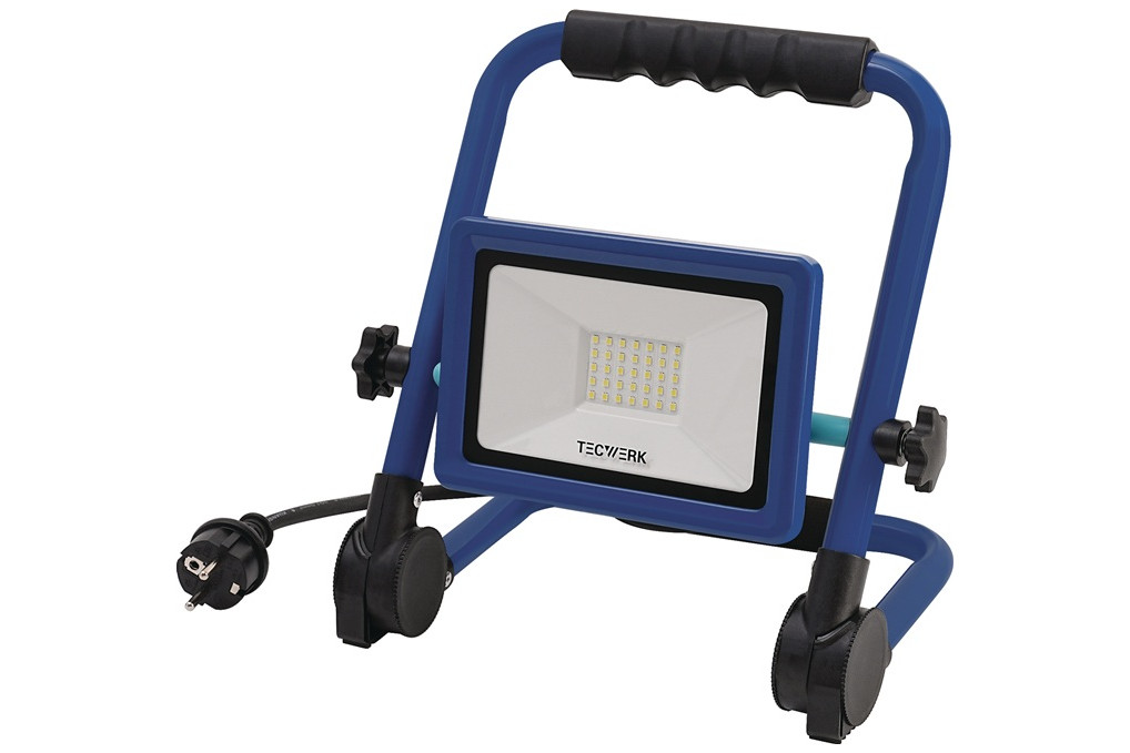 LED-Strahler 30 W 2200 lm 5m H07RN-F 3x1mm² IP65 TECWERKmobile High Power SMD-LED-Leuchte für großflächige Ausleuchtung · sofort helles Licht, extrem lange Lebensdauer der SMD-LED · Gehäuse aus Aluminium-Druckguss · standfestes Stahlrohrgestell mit ergonomisch geformten Kunststoffgriff · Technische Daten: Leuchte schwenk- und arretierbar Besonderheit: mit klappbarem Traggestell, ermöglicht einfachen und flexiblen Transport diese Leuchte enthält eingebaute LED-Leuchtmittel · die eingebauten Leuchtmittel können nicht ausgetauscht werden Weitere technische Eigenschaften: · Lebensdauer: 30000h · prüfpflichtig: ja