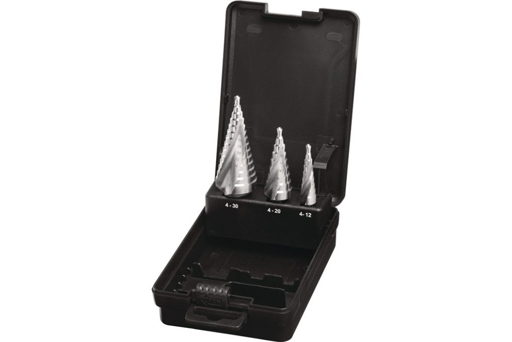 Stufenbohrersatz D.4-12/4-20/4-30mm HSS Spiralnut 3tlg.Ku.-Kass.TECWERKHSS · spiralgenutet · mit Kreuzanschliff · Schaft mit 3 Spannflächen · Steigung: Ø 4-12=1 mm, Ø 4-20=2 mm, Ø 4-30=2 mm