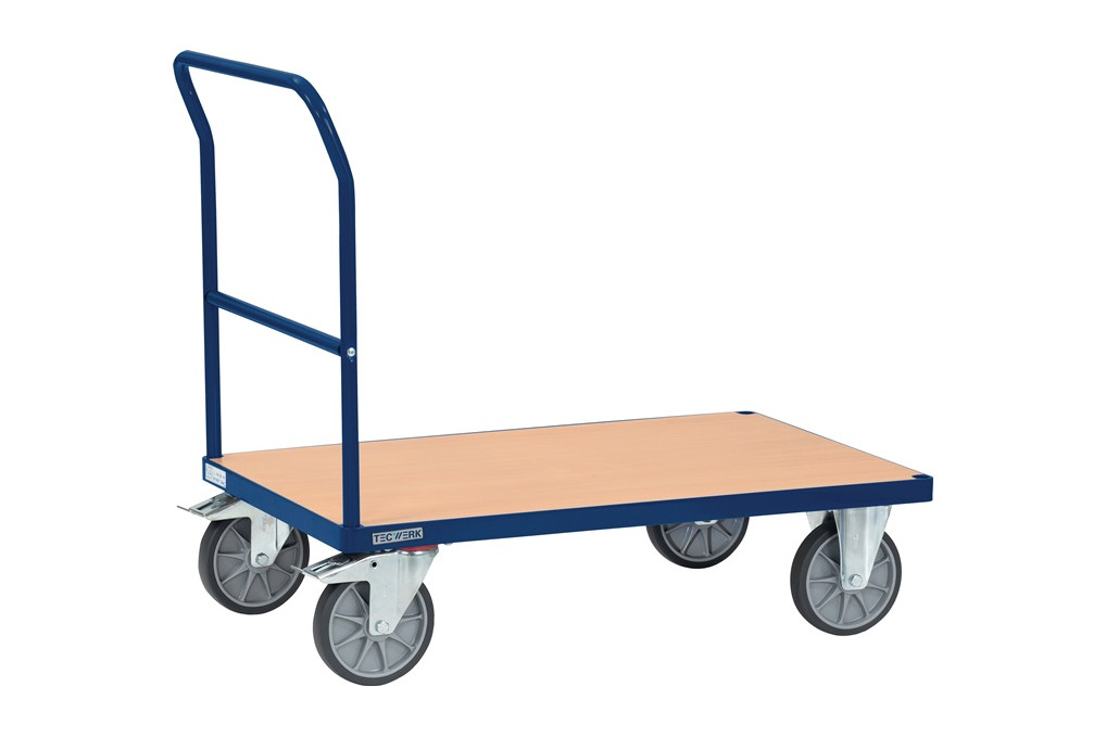 Plattformwagen Ladeflächen L1200xB800mm STA saphirblau Trgf.600kg TECWERKStahlrohr und Profilstahl geschweißt · pulverbeschichtet saphirblau, RAL 5003 · Ladefläche aus Holzwerkstoffplatte, Oberfläche Buchedekor · 2 Lenk- und 2 Bockrollen, Lenkrollen mit Feststeller · TPE-Bereifung · Naben mit Rillenkugellager · Zerlegte Anlieferung · Anwendung: Leichtlaufender Plattformwagen mit geringem Anfahr- und Rollwiderstand, ideal zum Transportieren und Kommissionieren von schweren Lasten. Weitere technische Eigenschaften: · Gesamtbreite: 809mm · Gesamthöhe: 990mm · Ladehöhe: 270mm · Bremssystem: mit Radfeststeller · Gewicht: 35kg · Gestell: Stahlrohr · Gesamtlänge: 1325mm
