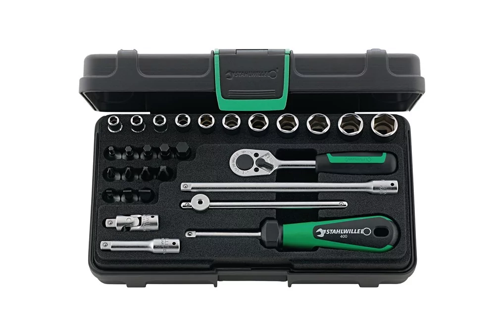Steckschlüsselsatz 40/23/6 29-tlg.1/4 Zoll SW 5-14mm Z.22 6KT STAHLWILLE6,3 mm (1/4 ″)-Vierkantantrieb · Einsätze und Bedienelemente aus Chrome-Alloy-Steel, verchromt · Inhalt: je 1 6-kant Steckschlüssel-Einsatz SW 5 / 5,5 / 6 / 7 / 8 / 9 / 10