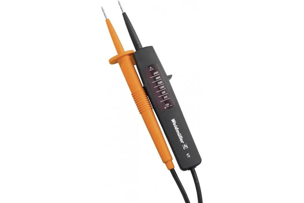 Spannungsprüfer VT 12-690 V AC/DC zweipolig WEIDMÜLLERPTC elektronisch geregelt · zum Prüfen von Spannung im Messbereich von 12 V – 690 V AC/DC · Messergebnis Anzeige über LED Technische Daten: Anzeige: LED Anzeigenbereich für Spannung: 12 V, 2
