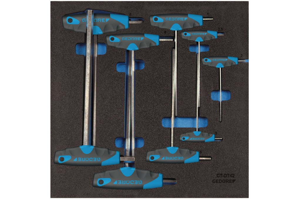 Werkzeugmodul 1500 CT2-DT 2142 9-tlg.2/3-Modul Winkelschraubendreher GEDORE(2/3 Modul) mit Winkelschraubendrehern mit T-Griffen · aus Vanadium-Stahl · mit Kugelkopf an der langen Klinge · chromatiert und blauem Griff mit Aufhängeloch Weitere te