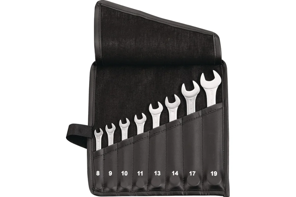 Ringmaulschlüsselsatz 8-tlg.SW 8-19mm Form A CV-Stahl in Rolltasche TECWERKCV-Stahl · verchromt · mit gleichen Schlüsselweiten · Ringseite 15° abgewinkelt, Maulstellung 15° DIN 3113 Form A / ISO 3318 / ISO 7738 Weitere technische Eigenschaften: · Material: CV-Stahl · Schlüsselweite min.: 8mm · Norm: DIN 3113 Form A, ISO 3318, ISO 7738 · Schlüsselweite max.: 19mm