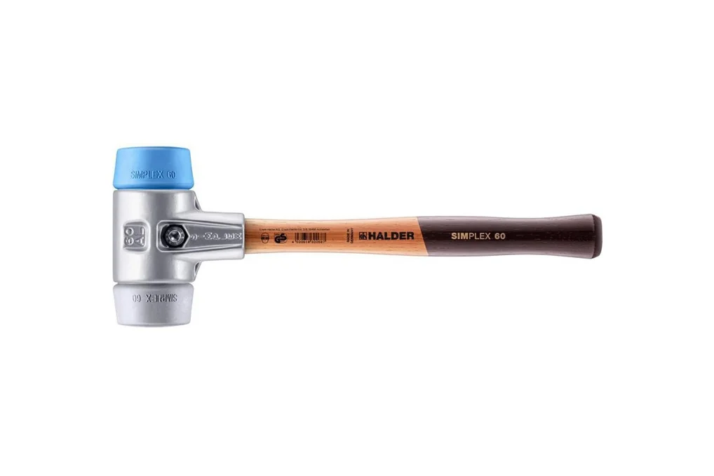 Schonhammer SIMPLEX L.405mm Kopf-D.60mm weich/mittelhart HOextra leichtes Aluminium-Gehäuse mit integrierter Stielschutzhülse - ideal für bruchempfindliche Materialien · Schlageinsätze und Simplex-Stiel sind leicht auswechselbar durch Lösen bzw. Spannen der Innensechskant-Spannschraube · hochwertiger, schwingungsdämpfender, ergonomisch geformter Holzstiel, Griffbereich doppelt lackiert (schmutzunempfindlich) · mit je 1 Stück Schlageinsatz aus TPE-soft, blau (weich), und TPE-mid, grau (mittelhart) · Anwendungsgebiete: Bruchempfindliche Platten verlegen, Fliesen legen, positionieren und justieren von leichten/empfindlichen Werkstücken, Schreinerei, Möbelbau Weitere technische Eigenschaften: · Stiel: Holz · Schlag: weich/mittelhart · Einsätze: TPE-soft/TPE-mid · Bezeichnung: SIMPLEX-Schonhammer · Breite: 150mm · Gehäuse: Aluminium Al · GS: ja · Härtegrad Schlageinsatz 1: 1 / 5 · Härtegrad Schlageinsatz 2: 2 / 5 · Höhe: 60mm · Konfliktmineralien frei: Frei von Konfliktmineralien: Dieses Produkt enthält keine als "Konfliktmineralien" bezeichneten Stoffe wie Tantal, Zinn, Gold oder Wolfram aus der demokratischen Republik Kongo oder angrenzender Länder. · Nennmaß: D=60 mm · Präferenzursprung: CE · Prop65: Enthält keine Proposition 65 Stoffe · REACH konform: enthält keine SVHC-Stoffe: Keine SVHC Substanzen mit mehr als 0,1% w/w enthalten – SVHC Liste Stand 11.07.2024. · RoHS-konform: RoHS-konform: Konform gemäß Richtlinie 2011/65/EU und Richtlinie 2015/863. · Schlageinsatz 1: (1): TPE-soft, blau, abriebfrei, weich · Schlageinsatz 2: (2): TPE-mid, grau, abriebfrei, mittelhart