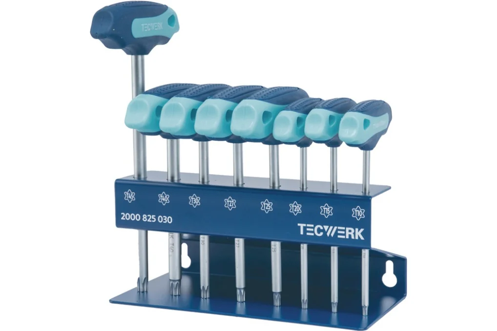 Schraubendrehersatz m.Quergriffen TX10-TX45 8-tlg.TECWERKmit 2-Komponenten-Griff · für Schrauben mit Innen-TORX®-Profil · Klinge S2-Stahl · verchromt · Besondere Produktvorteile: Der Werkstattständer kann sowohl auf die Werkbank gestellt als auch an der Wand montiert werden Weitere technische Eigenschaften: · Material: S2-Stahl · Oberfläche: verchromt