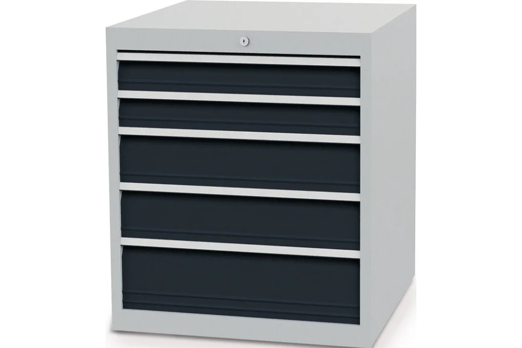 Schubladenschrank H819xB705xT736mm lichtgrau/grau 5 Schubl.Voll.BedrunkaGehäuse · Präzise Konstruktion aus hochwertigem Stahlblech · Gehäuse mit Rahmenverstärkung · Gesamttragfähigkeit 1500 kg Schubladen · Leichtgängige Schubladenführungen für maximalen Komfort mit 100 % Vollauszug · mit absoluter Einzelauszugsperre und Zentralverschluss, ein Kippen des Schrankes nach vorne ist ausgeschlossen · Innen liegende Aluminium-Griffleisten vermindern die Verletzungsgefahr durch hängenbleiben · Optimale Kennzeichnung durch Beschriftungsstreifen mit Klarsichtabdeckung · Geschlitzte Seitenwände bieten zahlreiche Möglichkeiten für individuelle Unterteilungen Lackierung · Alle Schubladenschränke werden mit einer hochwertigen und robusten Pulverbeschichtung (Strukturlack) geliefert Weitere technische Eigenschaften: · Schubladeninnentiefe: 600mm · Schubladeninnenbreite: 600mm