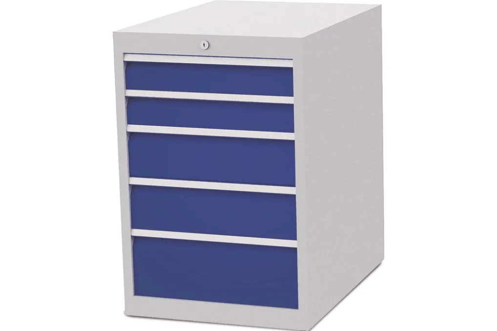 Schubladenschrank H819xB555xT736mm 5Schubl.lichtgrau/signalblaurobuste Stahlblechkonstruktion pulverbeschichtet, Gehäuse lichtgrau, RAL 7035, Schubladenfronten signalblau, RAL 5005 · Schubladen mit Vollauszügen 100 % ausziehbar, Tragfähigkeit 100 kg · Innenmaße B 450 x T 600 mm · integrierte Aluminium-Griffleiste mit Beschriftungsstreifen und Abdeckung · Zentralverschluss mit Zylinderschloss · der Deckel des Schrankes ist vorgebohrt für die Verschraubung mit einer Arbeitsplatte Weitere technische Eigenschaften: · Schubladeninnentiefe: 450mm · Schubladeninnenbreite: 600mm