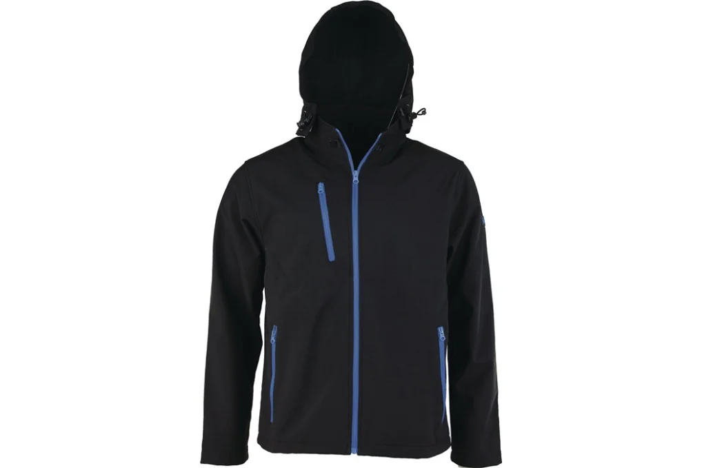 Softshelljacke Gr.M schwarz TECWERKMaterial: 96% Polyester / 4% Spandex, ca. 300 g/m² · TPU Membrane · winddicht · Wassersäule: 8000 mm · Atmungsaktivität: 1000 g/m²/24 h · abtrennbare Kapuze · 2 blaue Seitentaschen und 1 blaue Brusttasche, jeweils mit Reißverschluss · Fleecefütterung im Kragen · Armabschluss durch Klettverschluss verstellbar Weitere technische Eigenschaften: · Stoffgewicht ca.: 300g/m²