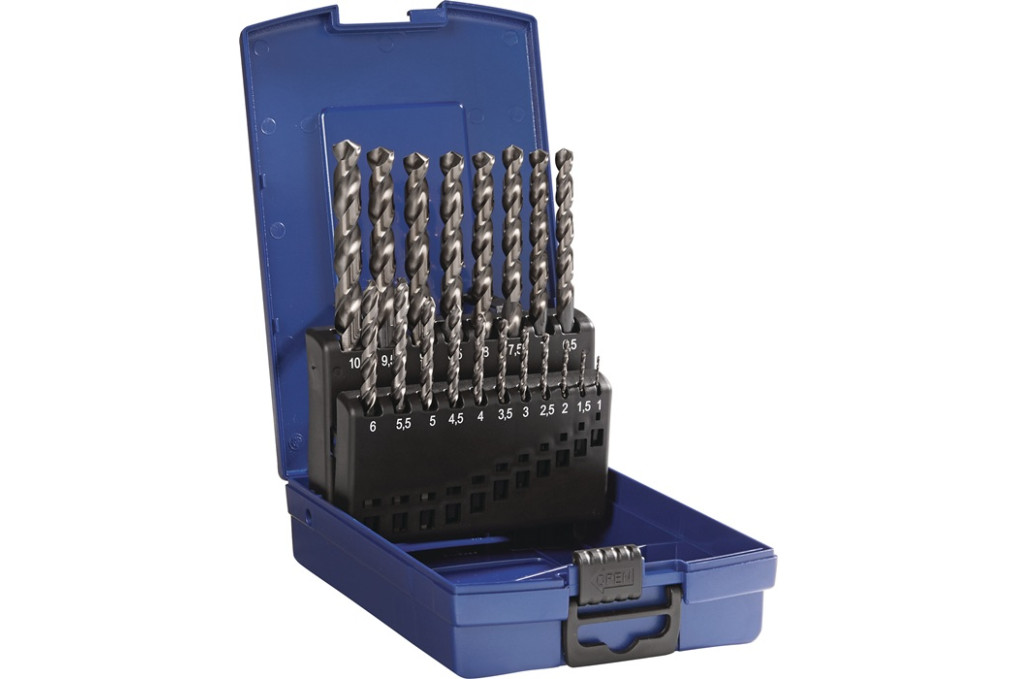 Spiralbohrersatz DIN 338 Typ TFL D.1-10x0,5mm HSS-Co5 fasennitr.19tlg.TECWERKHSS-Co5 · fasennitriert (ab Ø 3 mm) · DIN 338 · Typ TFL · Spitzenwinkel 130 ° · profilgeschliffen mit Kreuzanschliff ab Ø 2 mm · mit Zylinderschaft · rechtsschneidend · sehr hohe thermische Belastbarkeit · durch spezielle Nutausbildung bei schlechter Spanabfuhr bzw. für größere Bohrtiefen geeignet bis 8xD · zum Bohren von rostfreien Stählen, legierte und unlegierte Stähle (Bau-/ Automaten-/Vergütungs-/Einsatz-/Nitrier-/Werkzeug-/Schnellarbeits- und Federstähle) bis 1300 N/mm², Gusseisen, Kupfer, Messing, Aluminium und Kunststoff Industriequalität · in schlag- und bruchfester Kunststoffkassette Weitere technische Eigenschaften: · Qualität: profilgeschliffen