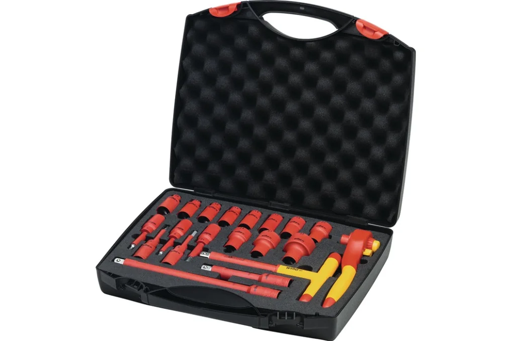 Ratschenschlüsselset 21-tlg.1/2 Zoll 10-32mm Außen 6kt.,4-10mm Innen 6kt.Z.72Steckschlüssel-Set 3/8″ (16-teilig, isoliert) Größen: 8–22 mm (Außensechskant) · 4/5/6/8 mm (Innensechskant) Inklusive: isolierter Ratschenschlüssel, Quergriff, 2 Verlängerungen Steckschlüssel-Set 1/2″ (16-teilig, isoliert) Größen: 10–32 mm (Außensechskant) · 4/5/6/8/10 mm (Innensechskant) Inklusive: isolierter Ratschenschlüssel, Quergriff, 2 Verlängerungen Funktion & Sicherheit: Der isolierte Ratschenschlüssel bietet durch Umschaltfunktion (Rechts-/Linkslauf) hohe Flexibilität. In Kombination mit den Verlängerungen können auch schwer zugängliche Schraubstellen erreicht werden. Steckschlüsseleinsätze und Verlängerungen werden mechanisch verriegelt, der Wechsel erfolgt per Auslöseknopf. Alle Teile sind geordnet in Schaumstoffeinlage untergebracht. Sicherheit: Stückgeprüfte Werkzeuge gemäß IEC 60900 · Einsatz bis 1.000 V AC zugelassen Weitere technische Eigenschaften: · Material: Chrom-Vanadium-Stahl · Rückschwenkwinkel: 5° · ESD Artikel: Nein · mit Batterie / Akku: Nein · SB - Verpackung: Nein · VDE zertifiziert: Ja · Werkzeug für Elektrik: Ja