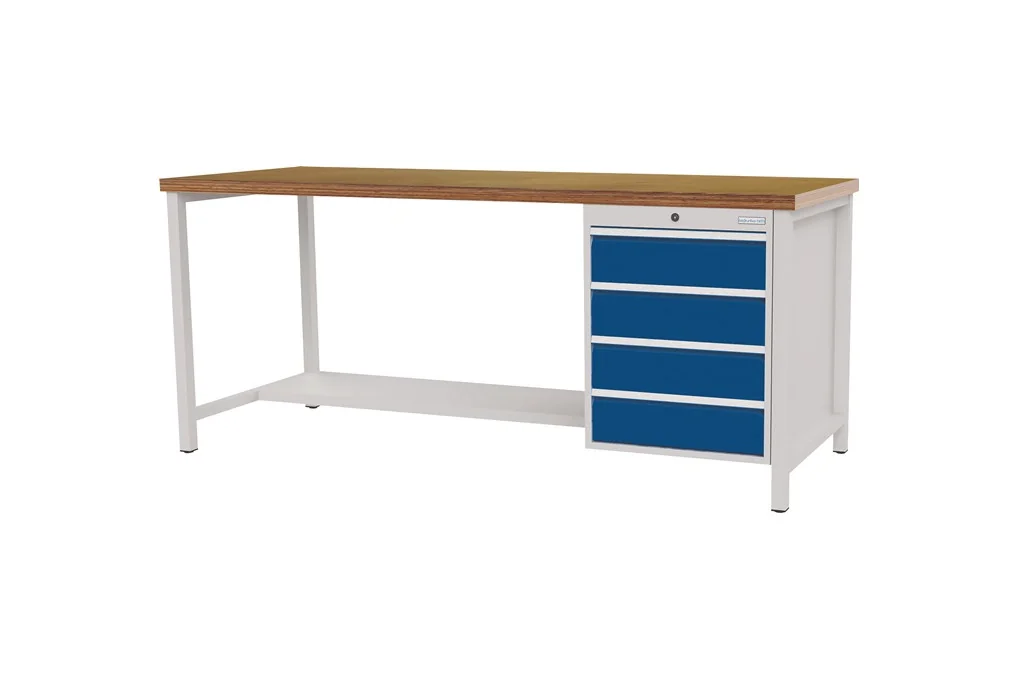 Werkbank signalblau lichtgrau B2000xH859xT750mm Buche Multiplex 40mm 4 Schubl.Arbeitsplatte · Mehrschichtig verleimte Buche-Multiplexplatte 40 mm stark, mit Lackleinöl imprägniert Werkbankgestell-/gehäuse · Robuste Konstruktion aus Stahlblech · Untergestell aus verschweißtem Vierkantrohr 40 x 40 x 2 mm, selbsttragend · Füße mit Niveauregulierung sorgen für festen Stand · Gesamttragfähigkeit 1000 kg Schubladen · Leichtgängige Schubladenführungen für maximalen Komfort · Schubladen mit 100% Vollauszug, Tragfähigkeit 100 kg, Schubladeninnenmaße B 450 x T 600 mm, Art.-Nr. 9000 426 064 - 9000 426 065, 9000 426 070 - 9000 426 071 B 600 x T 600 mm · Innen liegende Aluminium-Griffleisten vermindern die Verletzungsgefahr durch hängenbleiben · Optimale Kennzeichnung durch Beschriftungsstreifen mit Klarsichtabdeckung · Türen und Schubladen sind durch ein Zylinderschloss abschließbar Lackierung · Alle Werkbänke werden mit einer hochwertigen und robusten Pulverbeschichtung (Strukturlack) geliefert Weitere technische Eigenschaften: · Anzahl Ablageböden: 1 · Tragfähigkeit pro Schublade: 100kg