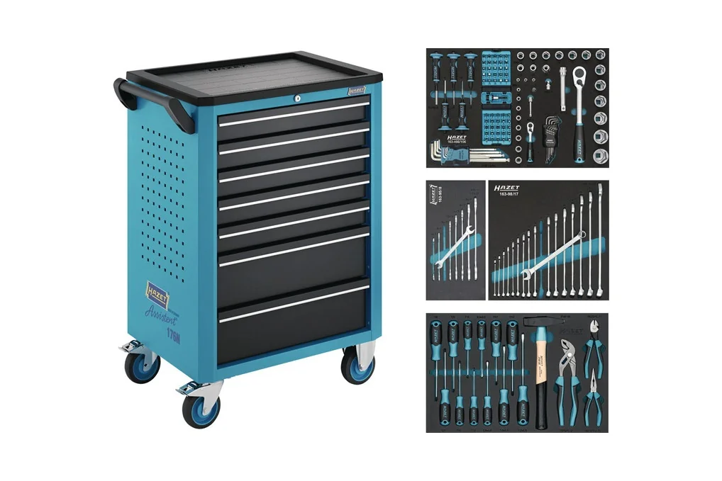 Wkz.wagen 176N-7/193 B498xT780xH1018mm 480kg 7 Schubl.HAZETAnwendung: Effiziente · mobile Organisation von Werkzeug. Werkzeug- · Material- und Montagewagen. 5 flache und 2 hohe Schubladen. Komplett mit 147-teiligem Werkzeug Sortiment in Safety-Insert-System Weichschaumeinlage. Hohe Flexibilität. Griff und Rollen wahlweise links oder rechts montierbar. Praktisches HAZET Design. Griffleisten für angenehme Haptik. Kunststoffhaube mit Texturen und großer vertiefter · komplett nutzbarer Arbeitsfläche. Komplett abgedichtete Arbeitsfläche schützt Wageninneres bei auslaufenden Flüssigkeiten. Abgeschrägte Kanten vermeiden Beschädigungen. Zahlreiche Befestigungsmöglichkeiten. Zubehör · wie z. B. HAZET Papierkorb · Dosenhalter an linker und rechter Seite montierbar. Rückwärtige Schraubpunkt zur Montage von weiterem Zubehör. Arbeitsflächen. Deutlich vergrößerte Ablage- und Arbeitsfläche in Kunststoff. Modernes Oberflächendesign der Arbeitsfläche. Lösemittelbeständige Arbeitsfläche schützt Wageninneres bei auslaufenden Flüssigkeiten. Umrandung der Arbeitsfläche schützt Teile vor Herabfallen. Korpus / Fahrgriff. Extrem robuste Ausführung durch doppelwandige Konstruktion. Komplette Schweißkonstruktion des ganzen Korpus für den täglichen harten Werkstatteinsatz. Individuelle Befestigungsmöglichkeiten durch Quadrat-Lochraster auf Seitenwänden · z. B. für HAZET Hakenprogramm Artikelgruppe 112 für Werkzeuge oder andere Anbauteile wie z. B. Dosenhalter · Papierrollenhalter · Papierkorb · etc.. Stabiler Fahrgriff beidseitig fest am Korpus montierbar. Verriegelungs-Konzept. 2-stufige VerriegelungZentralverriegelung · abschließbar durch Zylinderschloss mit 2 Knickschlüsseln. Gegenseitige Auszugssperre für minimales Kipprisiko. Schubladen-Konzept. Gegenseitige Verriegelung der Schubladen verhindert ungewolltes Öffnen. 100 % Auszug mit Rollenführungen. Schubladendesign zur optimalen Nutzung des Innenraums. Schubladenfronten für optimiertes Handling. Schmutzunempfindliche Schubladen-Beschichtung zur einfachen Reinigung. Hochleistungs-Fahrwerk. Große stark belastbare Räder mit Präzisionskugellager und zweifachem Kugelkranz im Schwenklager · einfaches Bewegen auch bei hoher dynamischer Last. 2 Lenkrollen mit Doppelstopp: Gebremste Rollen verhindern Wegrollen. Gebremste Schwenklager verhindern Drehen der Lenkrollen · z. B. auf schrägen Flächen. Schutzring verhindert Eindringen von Schmutz und Fäden. Elastikrollen ermöglichen ruhigen Lauf. Gesamttragkraft (dynamisch): 480 kg. Gesamttragkraft (statisch): 480 kg. Traglast hohe Schublade: 20 kg. Farbe: HAZET blau. Maße: 780 mm x 498 mm x 1018 mm. (Schubladen)größe für Ordnungssystem: 3/3. Höhe Arbeitsfläche: 1002 mm. Anzahl Bockrollen: 2 (∅ 125 mm). Anzahl Lenkrollen: 2 (∅ 125 mm). Anzahl Werkzeuge: 147. Weitere technische Eigenschaften: · Schubladeninnentiefe: 348mm · Schubladeninnenbreite: 522mm · (Schubladen)größe für Ordnungssystem: 3/3 · Anzahl Bockrollen: 2 · Anzahl Lenkrollen: 2 · Anzahl Rollen mit Bremse: 2 · Durchmesser Bockrollen: 125mm · Durchmesser Lenkrollen: 125mm · Gesamttragkraft (dynamisch): 480kg · Gesamttragkraft (statisch): 480kg · Höhe Arbeitsfläche: 1002mm · Lieferumfang: 176N-7, 163-95/8, 163-98/17, 163-330/16N, 163-466/106 · Schublade Abmessung: 522 x 348 · Schublade Ausführung: 100% Auszug mit Rollenführung, Gegenseitige Auszugssperre für minimales Kipprisiko, Zentralverriegelung mit Zylinderschloss mit 2 Knickschlüsseln · Schublade Auszug %: 100% · Schublade Führung: Mit Rollenführung · Schublade Höhe (flach): 81mm · Schublade Höhe (hoch): 166mm · Schublade Verriegelung: Gegenseitige Auszugssperre für minimales Kipprisiko · Schublade Verschluss: Zentralverriegelung mit Zylinderschloss, Mit 2 Knickschlüsseln · Zubehör: 161N-3D/2, 179N-33, 179N-35, 179N-45, 179N-46, 180-24, 180-34, 179N-55, 179N-56, 179N-57
