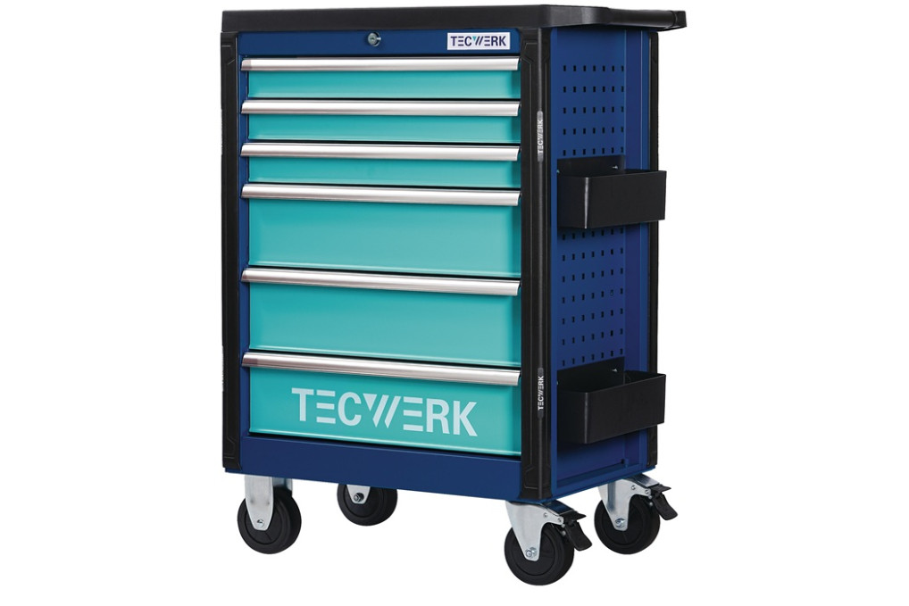 Wkz.wagen PLUS 2.0 B760xT465xH1030mm 500kg 6 Schubl.96-tlg.Stahlbl.TECWERKkomplett mit 96-teiligem Werkzeugsortiment · mit 6 Schubladen · Handgriff · kugelgelagerte, mit Teleskopschienen herausziehbare Schubladen mit 100 % Auszug mit jeweils einer Antirutschmatte · automatischer Schubladeneinzug · Einteilerset für 4 Schubladen im Lieferumfang enthalten · mit Zentralverriegelung (nur eine Schublade gleichzeitig geöffnet) · abschließbar mittels eingebauten Zylinderschloss mit 4 Schlüsseln · beschriftbare Schubladen · Kunststoffabdeckung · hochwertige PVC-Rollen Ø 127 mm– 2 starre und 2 lenkbare Rollen mit Feststellung · beidseitiges Lochwandsystem (9 x 9 mm) für einfache Installation von Zubehörartikel · 2 Dosenhalter mit Lochung für Schraubendreher (im Lieferumfang enthalten) · durchgehender seitlicher Kantenschutz robuste Ablagefläche aus Polypropylen mit Ablagefächer für Kleinteile Maß über alles aufgebaut mit Griff und Rädern (B x T x H) 760 x 465 x 1030 mm Maß nur Korpus (B x T x H) 678 x 459 x 817 mm Innenmaß Schubladen (B x T x H) 3 x 568 x 398 x 75 mm Innenmaß Schubladen (B x T x H) 3 x 568 x 398 x 154 mm Tragkraft pro Schublade 30 kg / statische Gesamtbelastbarkeit 500 kg Weitere technische Eigenschaften: · Anzahl Längsteiler: 8 · Anzahl Querteiler: 8 · Schubladeninnentiefe: 398mm · Schubladeninnenbreite: 568mm · Schubladenhöhe: 75 mm,154mm